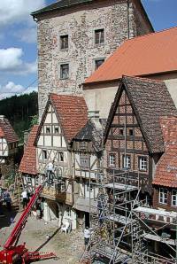 Terry Gilliam's project Brothers Grimm has been shooting in Prague now for five weeks. The film began shooting on 30 June at the medieval Krivoklat Castle, outside the Czech capital. The shoot is scheduled to last 17 weeks, mostly on stages and the backlot at the Barrandov Studios. The first photos of the medieval village built on the backlot at Barrandov for Brothers Grimm have appeared at FilmPub. Since shooting began, Uma Thurman has been confirmed in the cameo role of an evil queen. And Czech actor Tomas Hanak is to play a character that Robin Williams was to have played as a second role. Fangoria magazine gives the movie's storyline more detail: "Brothers Grimm is a dark fantasy about the two "Brothers Grimm" who travel around the Napoleonic countryside vanquishing fake monsters and demons in exchange for cash. When the French government figures out what they're up to, they force the brothers to deal with the real thing, a number of murders being committed under mysterious circumstances in the northern woods between Germany and France. It is there that they have to try and discover what's really happening and deal with it before more people are killed or their lack of success leads to the guillotine." A book about the making of the film - featuring with Gilliam's diary - will be published by Harper Collins upon the movie's release next summer. It is to be written/edited with Bob McCrobe. (Many thanks again to Felicity who is currently performing painstaking research on Brothers Grimm for her website - the Matt Damon Column.) 30 June 2003 Brothers Grimm shooting is underway in Prague. Here is a report from Scott McMillan for ScreenDaily, confirming that Robin Williams is not on the project any more. And with Nicole Kidman confirmed as not taking part, the movie is still in need of a actress for a cameo role as a queen. "Terry Gilliam's $75m Brothers Grimm kicks off its 17-week shoot in Prague today, with Matt Damon, Heath Ledger, Lena Heady, Peter Stormare and Jonathan Pryce in the main roles. The shoot will travel around the Czech Republic for the next two weeks, with Czech castle and cathedral towns including Krivoklat, Kacina, Kutna Hora and Ledec doubling for the 19th-century German countryside. MGM and Miramax, via its Dimension subsidiary, are teaming up on the fantasy production, which casts Damon and Ledger as Jacob and Wilhelm Grimm, the fairy-tale brothers, who in Gilliam's version are Jake and Will, two 19th-century con artists who meet their match when they encounter an actual curse. Gilliam, Ehren Kruger and Tony Grisoni wrote the screenplay. Robin Williams is no longer on board, and recent negotiations with Nicole Kidman for a small part failed to pan out, a source on the set told Screendaily. Charles Roven and Daniel Bobker are producing, with John D Scofield as executive producer. Director of Photographer is Nicola Pecorini, Gabriella Pescucci is handing costume design and Guy Hendrix Dyas serves as production designer. Prague-based upstart production service company Reforma Films is overseeing services for the shoot, which is based at Prague's Barrandov studio complex, together with Etic." 28 June 2003