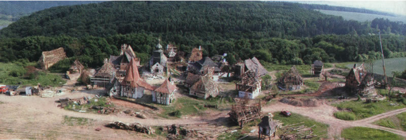Film director Terry Gilliam is back to work. This is a good thing. After all, it's more than six years since his last film Fear and Loathing in Las Vegas started shooting. In recent months, he has been making a picture called The Brothers Grimm at the Barrandov Studios in Prague, with a sizeable budget and an enviable cast. Loosely based on the stories collected by the real Brothers Grimm of the nineteenth century, the film features Matt Damon, Heath Ledger, Jonathan Pryce, and Peter Stormare. I paid a visit to the Czech Republic set in September. I was to visit a couple of night shoots. "Bring warm clothes and be prepared", I was warned, "for cold and wet weather". It's 8pm, and I'm collected at my Prague hotel to be taken to Barrandov in Gilliam's black Mercedes. Whisking straight past security and the studio buildings, we stop in a car park full of trailers. I am met by Terry's daughter Amy who is working as his assistant, and I'm escorted to the set. I am instructed to remain very quiet during shooting, to have my phone turned off and never walk in front of the camera while it's shooting. Sensible advice indeed. Equipped with a tight-fitting pair of Wellington boots borrowed from the director's trailer, I head towards the studio backlot. It's day 51 of the shoot. We are on a hill overlooking the city of Prague, with its romantic attractions shimmering in the distance. As I approach the set, my eyes are drawn to a delightful constructed village to my left. It is extremely bright, since it is floodlit by enormous lights on my right, which are themselves just in front of a forest of very tall trees. I say a forest... it is in fact a thin stretch of imported trees giving a good impression of being a forest. In the middle is an acre or two of grassland where the members of the film crew are standing, setting up the first shot of the night. I'm told that not only has the village been built, but the trees and the grass have been brought in to create this external set. It's cold, it's dark, and it's damp. I lurk behind the monitors where the acting talent have their seats, not that any of the stars are here at the moment. The food tent is pointed out to me, and it's not long before I help myself to something to get me through the night. The first of many visits.