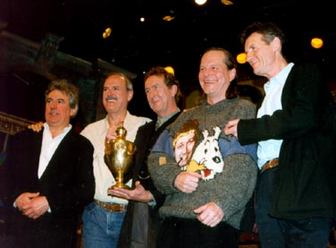 ![]() The six Pythons reunited in Aspen in March (pictured in PythOnline...) John Cleese spoke to BBC Radio 4's Today programme on 9 March 1998... "One of the reasons we decided to do this little thing for HBO up in Aspen was that it actually gave us a chance to get together to discuss some other matters. What we found this time was that there was a lot of enthusiasm for the idea of doing something next year, because it is after all our 30th anniversary. Everyone seemed to think that doing the stage show or at least a new version of the stage show would be a lot of fun. So we're going to pursue those possibilities, but I guess we would certainly do it in London and New York. How long it would be and whether we go to other cities we'll just have to figure out over the next few months. "The problem is it's the fans who want the old stuff and we're the ones who like to introduce something a little bit new. This may seem surprising, but I can assure you this is the case. It's a question of striking a balance between our desire to do a show that's new in quite a few ways and the fans' desire to see the dear old golden oldies trotted out yet one more time. We'll have to see whether we can still do it at our age. I guess energy's going to be the main problem. "It'll probably be timed to coincide with the 30th anniversary. I think the first show went out back in 1969 at the beginning of October so we'll probably do September/October/ November - that sort of period, but as I say the details are simply not worked out at all. We've only just reached a decision that we would love to do something together and it felt like fun and it felt appropriate. I confidently expect this to be a fairly resounding failure."